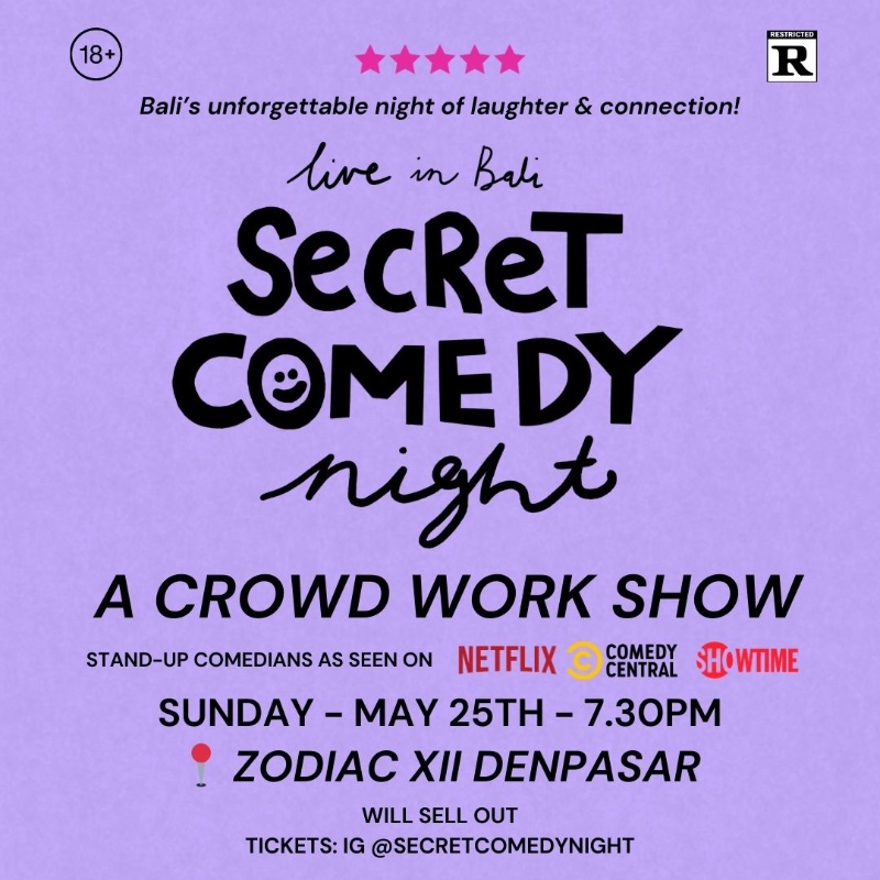 Secret Comedy Night Seminyak brings top stand-up comedians, as seen on Netflix, Comedy Central, and Showtime, for an unfiltered, interactive comedy experience! Expect raw humor, quick wit, and non-stop laughs in a crowd work show like no other on Sunday, May 25 at a secret location in Denpasar.
