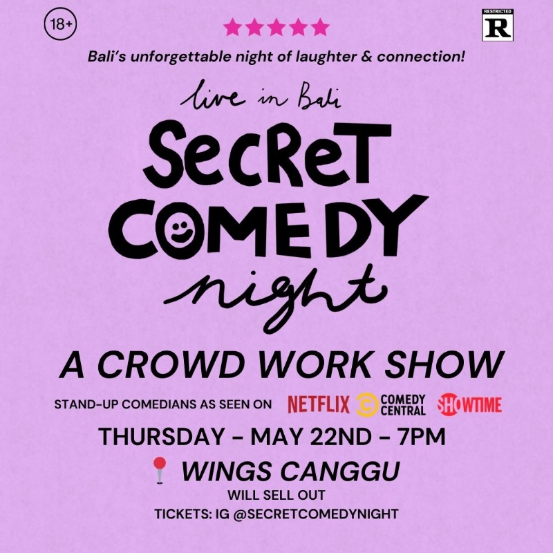 Don’t miss Secret Comedy Night Canggu happening Thursday, May 24, 7PM at Wings Canggu. This isn’t your average open mic. It’s a full-blown crowd work comedy show with zero scripts, just pure interaction and off-the-cuff jokes from top comedians seen on Netflix, Comedy Central, and Showtime.