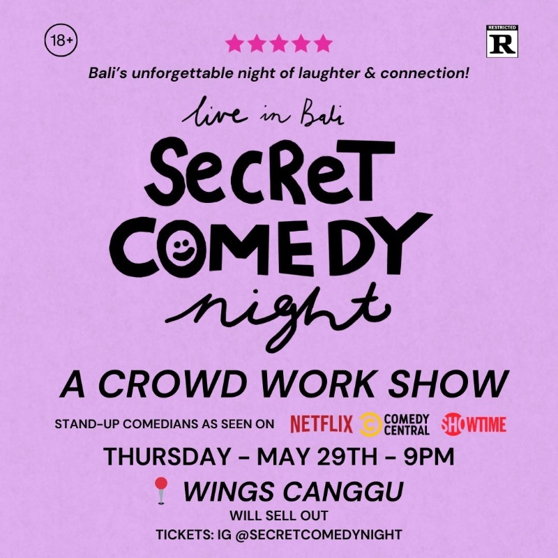 Secret Comedy Night in Canggu is an unscripted, crowd work stand-up show featuring top comedians from Netflix, Comedy Central, and Showtime. With no prepared jokes, the show is entirely raw and interactive, allowing the audience to shape the night with their energy and suggestions. Expect a laid-back, spontaneous, and laughter-filled evening at Wings Canggu on Thursday, May 29th. Doors open at 8.10 PM for food and drinks, with the show starting at 9 PM. Tickets are limited, so don’t miss out!