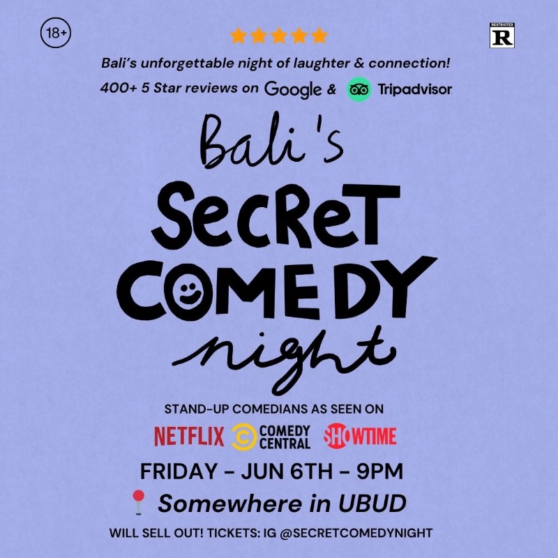 Secret Comedy Night Ubud brings top comedians from Netflix, Comedy Central, and Showtime for an intimate, interactive stand-up experience at a secret location. Taking place on Friday, June 6, the event kicks off with doors opening at 8 PM, followed by the show starting at 9 PM. Tickets are limited!